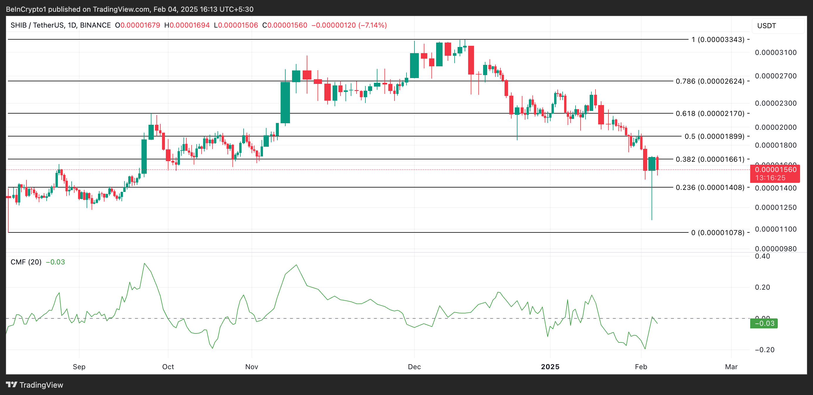 Na wykresie dziennym wskaźnik przepływu pieniędzy Chaikina (CMF) dla SHIB wspiera powyższe niedźwiedzie prognozy. Na moment pisania tego tekstu, wskaźnik CMF jest poniżej zera na poziomie -0,03, co wskazuje na silną aktywność sprzedażową wśród traderów.