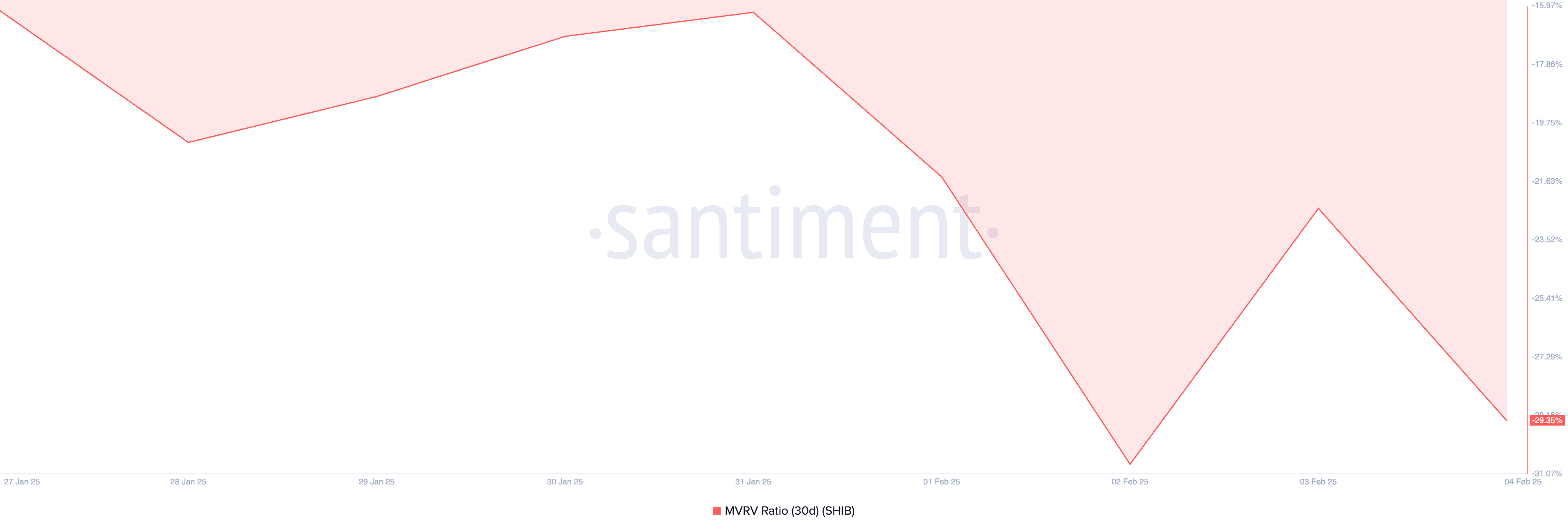 Ocena wskaźnika wartości rynkowej do wartości zrealizowanej (MVRV) dla SHIB przy użyciu 30-dniowej średniej kroczącej potwierdza jego niedowartościowany status. Według danych Santiment ten wskaźnik wynosi -29,35% w momencie publikacji.