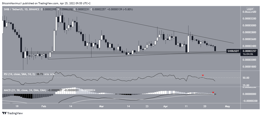 Od 7 lutego 2022 r. kurs Shiba Inu spada wzdłuż opadającej linii oporu. Doprowadziło to do lokalnego dołku na poziomie 0,000020 USD 17 dni później. Dołek ten posłużył do utworzenia długiego dolnego knota (zielona ikona) i stworzenia nachylenia dla wznoszącej się linii wsparcia.
