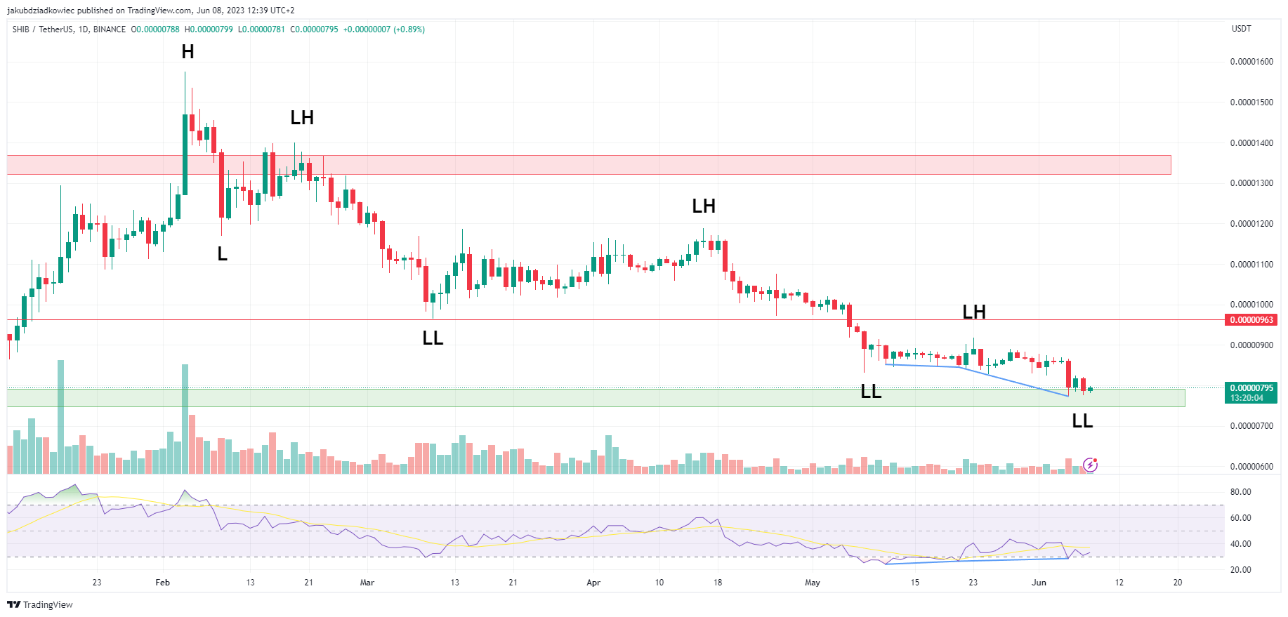 Analiza dziennego interwału dla kursu Shiba Inu ukazuje wyraźny trend spadkowy. Trwa on od lokalnego szczytu na poziomie 0,00001575 USD z początku lutego 2023 roku. Później cena SHIB wygenerowała 3 kolejne niższe szczyty (LH) i 3 niższe dołki (LL).