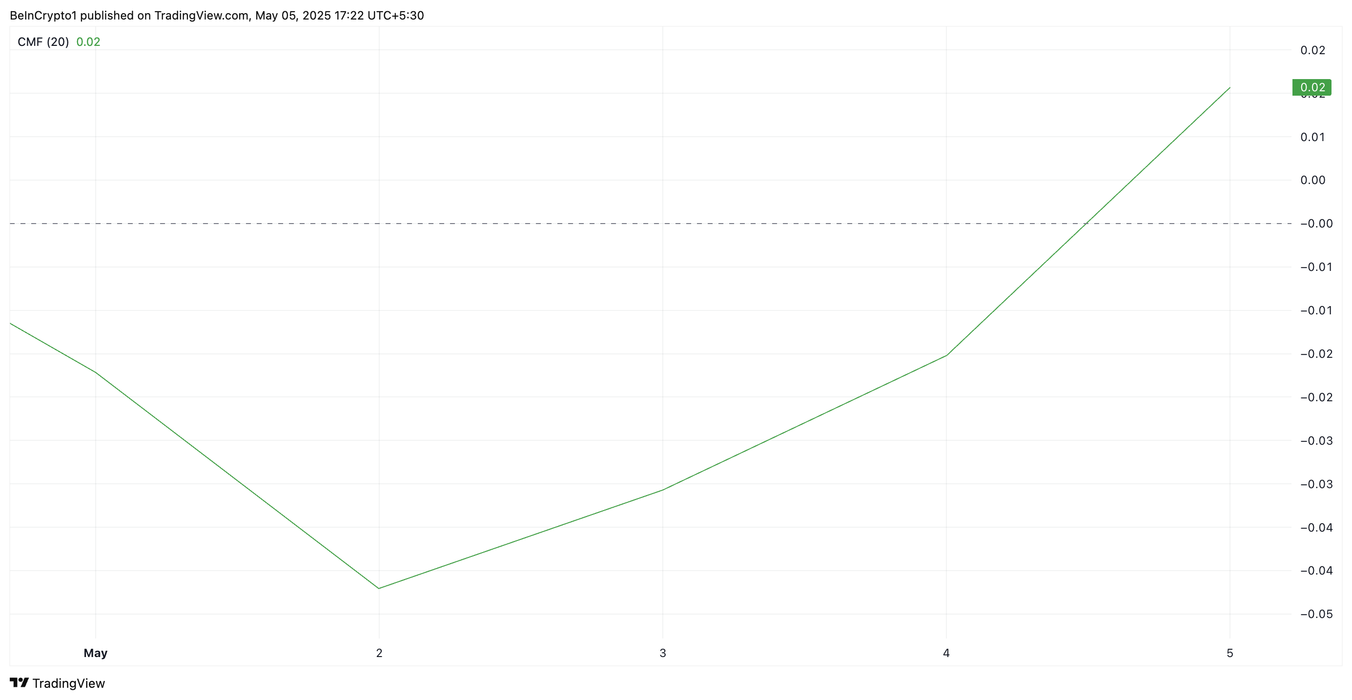 Na wykresie dziennym rośnie wskaźnik przepływu pieniędzy Chaikina (CMF) dla SHIB, który śledzi wolumenowy napływ i odpływ kapitału. Dzieje się tak, mimo że cena memecoina spada. W momencie pisania tego tekstu wskaźnik momentum wynosi 0,02, przekraczając neutralną linię zerową.