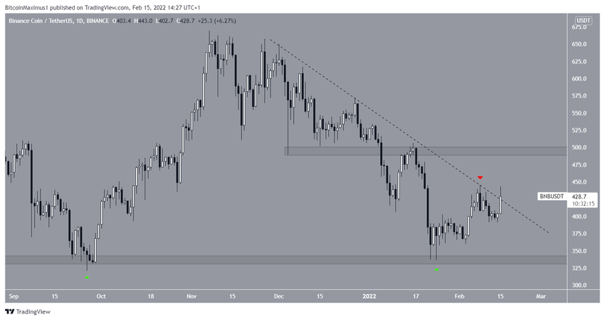 BNB również podąża za opadającą linią oporu od grudnia, jednak nie zdołał się jeszcze z niej wybić. Ostatnio został odrzucony przez tę linię w dniu 13 lutego (czerwona ikona). Jednakże, jest on w trakcie ponownego wybicia.