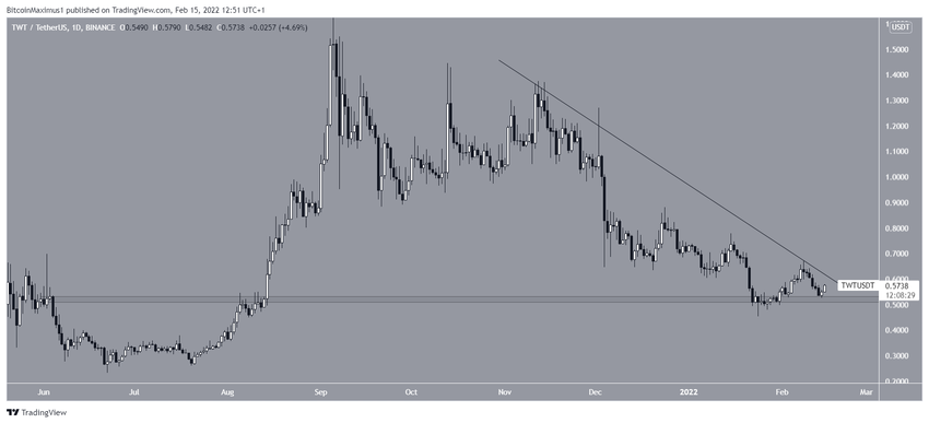 TWT podąża za opadającą linią oporu od listopada 2021 roku. W tym czasie spadła do dołka na poziomie 0,45 USD w dniu 24 stycznia.
