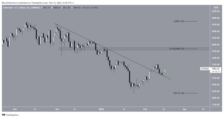 W dniu 7 lutego ETH przełamał opadającą linię oporu, która wcześniej obowiązywała od 1 grudnia. Następnie powrócił do wsparcia, które zostało potwierdzone 13 lutego (zielona ikona).