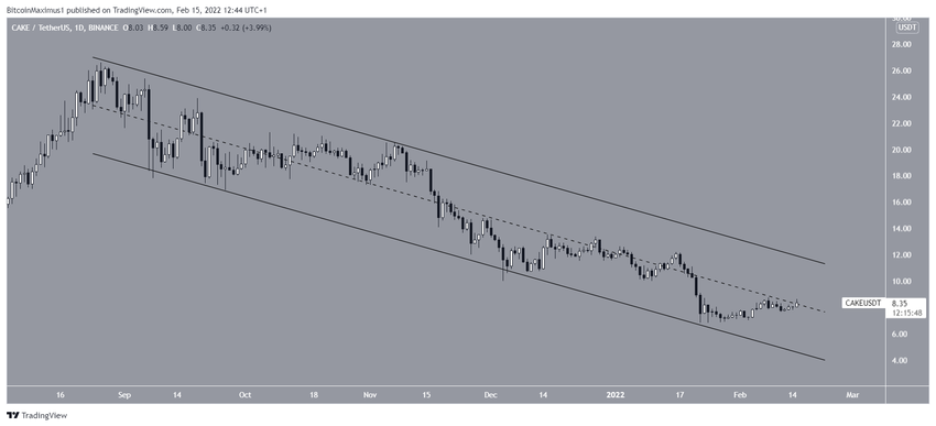 CAKE od sierpnia 2020 roku spada wewnątrz równoległego kanału zniżkującego. Ruch spadkowy doprowadził do dołka wszech czasów (ATL) na poziomie 6,81 USD w dniu 22 stycznia. Dołek ten posłużył do potwierdzenia linii wsparcia kanału.