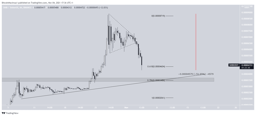Na wykresie sześciogodzinnym widać, że SHIB załamał się z trójkąta symetrycznego.