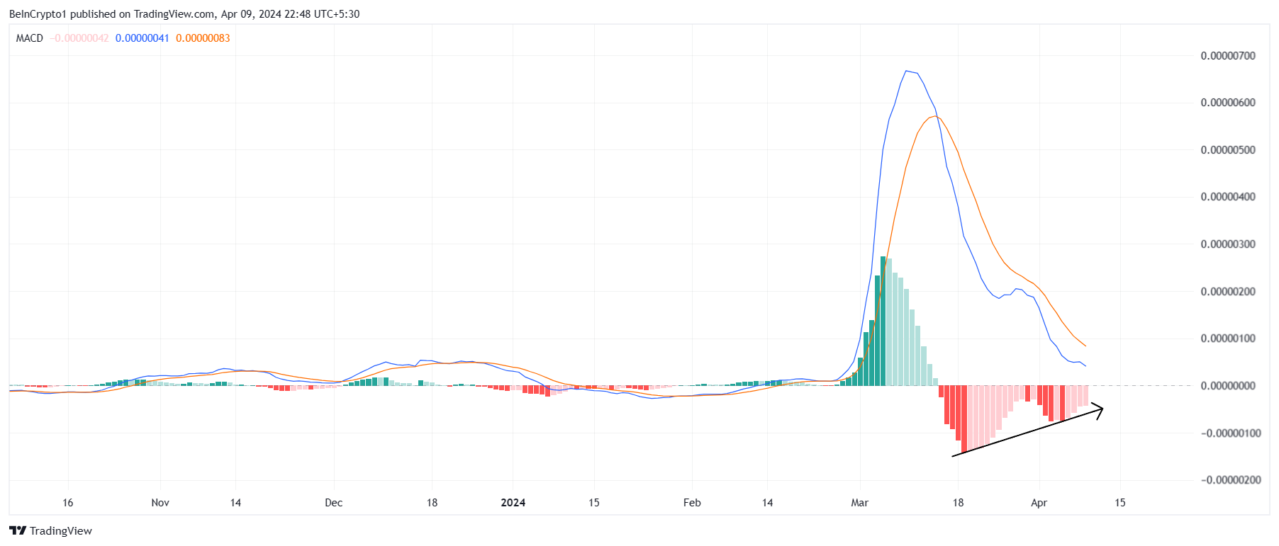 Cena Shiba Inu jest obecnie notowana w ramach wzorca symetrycznego trójkąta, wspomaganego przez coraz bardziej zwyżkowe sygnały rynkowe. Pierwszym z nich jest dywergencja średniej ruchomej (MACD). Ten podążający za trendem wskaźnik dynamiki jest wykorzystywany do identyfikacji potencjalnych okazji do kupna i sprzedaży.