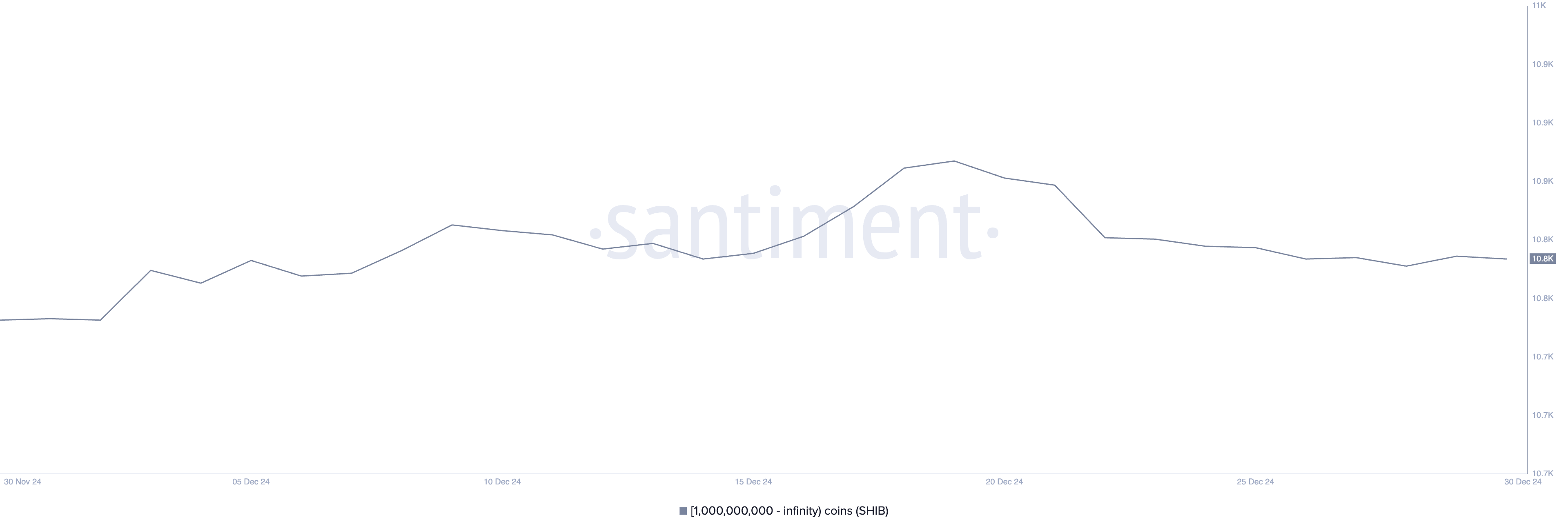 Wieloryby Shiba Inu, zdefiniowane jako adresy posiadające co najmniej 1 miliard SHIB, osiągnęły miesięczny szczyt na poziomie 10 930 w dniu 19 grudnia, ale od tego czasu systematycznie spadają.