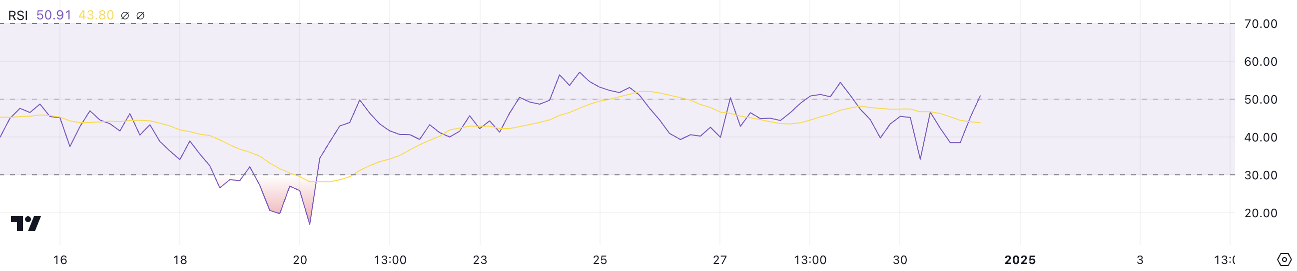 RSI dla Shiba Inu wynosi obecnie 50,9, utrzymując swoją pozycję w strefie neutralnej od 20 grudnia. Ten poziom wskazuje na równowagę między presją kupna a sprzedaży, bez wyraźnej dominacji którejkolwiek ze stron. Stabilność RSI sugeruje, że cena SHIB konsoliduje się, ponieważ traderzy pozostają niezdecydowani co do dalszego kierunku.