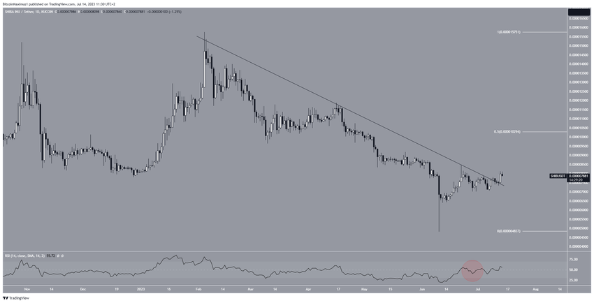 Jednak w dniu 13 lipca cena Shiba Inu przebiła linię oporu. Co więcej, wskaźnik RSI wzrósł w tym czasie powyżej 50.