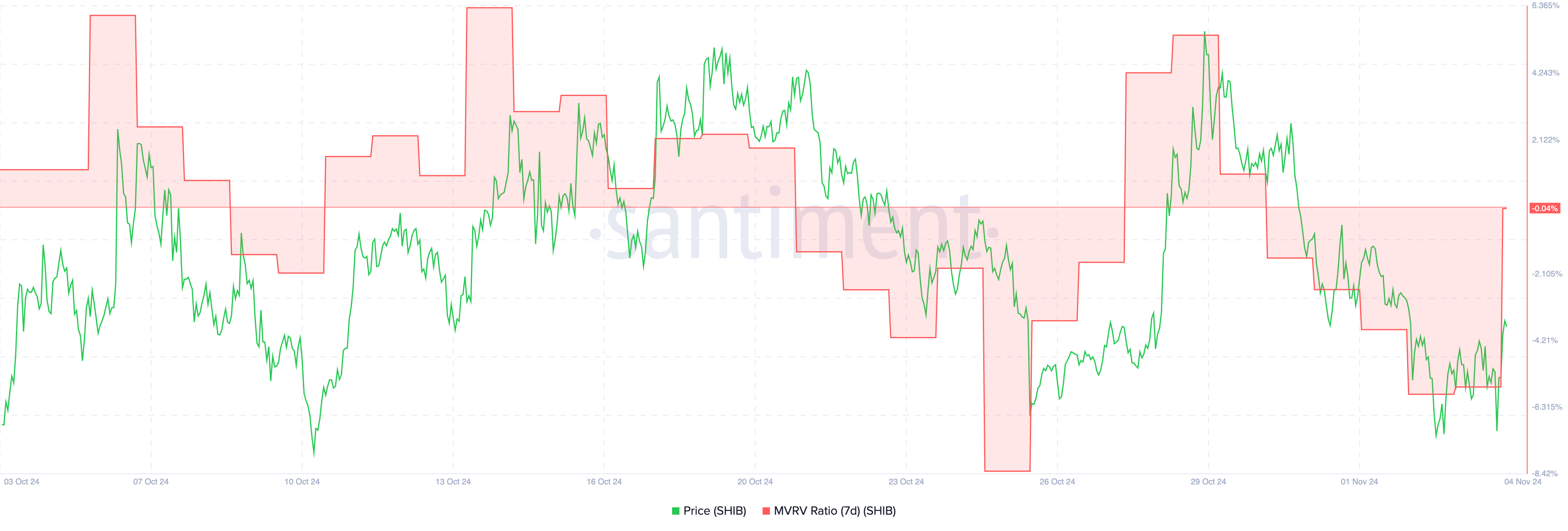 Obecnie MVRV SHIB z ostatnich 7 dni wynosi -0,04%, co wskazuje, że ostatni nabywcy są blisko punktu rentowności, z minimalnymi zyskami lub stratami. Wskaźnik MVRV (Market Value to Realized Value) porównuje obecną cenę do średniej ceny nabycia z ostatniego tygodnia, dostarczając wglądu w krótkoterminową rentowność.
