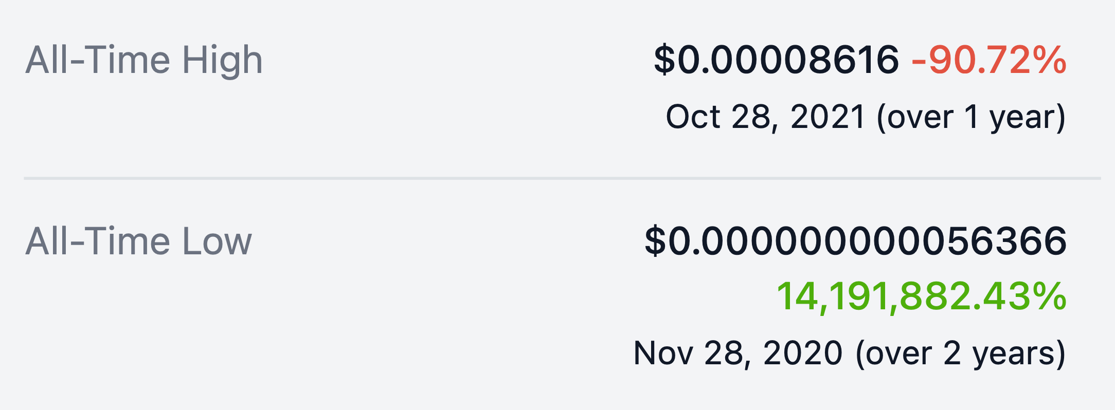 SponsoredObecnie SHIB traci ponad 90 procent od swojego rekordowego poziomu. Mimo to wartość tokena jest nadal setki razy wyższa niż najniższa zarejestrowana na platformie CoinGecko.