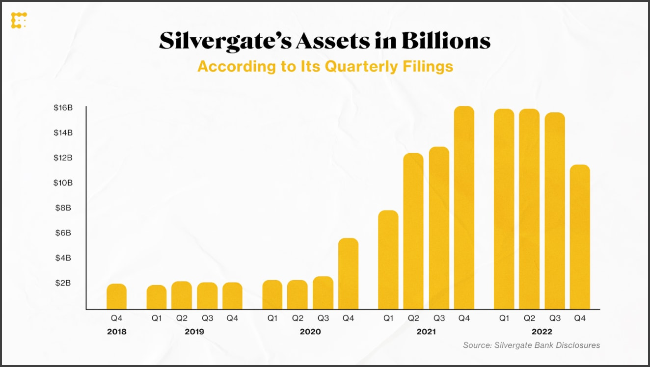 - Do 2014 roku Silvergate zajmował się głównie depozytami detalicznymi, ale potem otworzył się i przejął szybko rozwijający się rynek kryptowalut. Pierwszym klientem kryptowalutowym Silvergate był DCG. W 2017 roku bank miał już 250 klientów i 1,9 miliarda dolarów w aktywach.