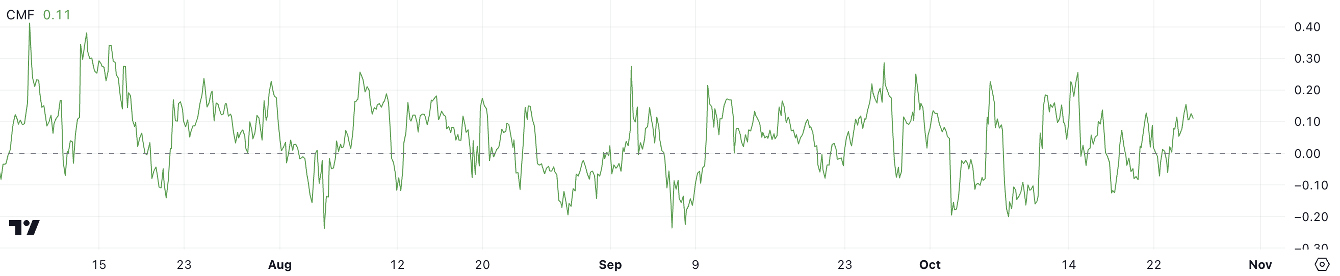 Przepływ pieniędzy Chaikina (CMF) to wskaźnik, który mierzy presję kupna i sprzedaży aktywa. Waha się między -1 a 1. Gdy CMF jest dodatni, pokazuje, że presja kupna jest większa niż presja sprzedaży. W ostatnich miesiącach, nawet gdy CMF dla XRP stał się pozytywny, nie prowadziło to konsekwentnie do wzrostów ceny.