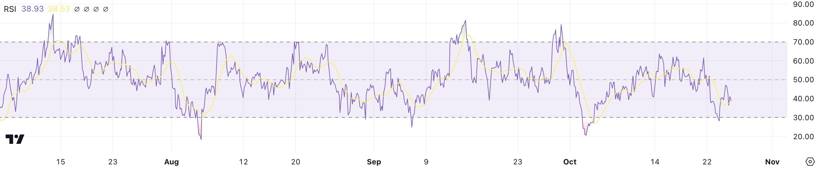 Wskaźnik siły względnej (RSI) to metryka momentu używana do mierzenia dynamiki i zmian ruchów cenowych. Waha się od 0 do 100, przy czym wartości powyżej 70 wskazują na warunki wykupienia, a wartości poniżej 30 sugerują, że aktywo jest wyprzedane.