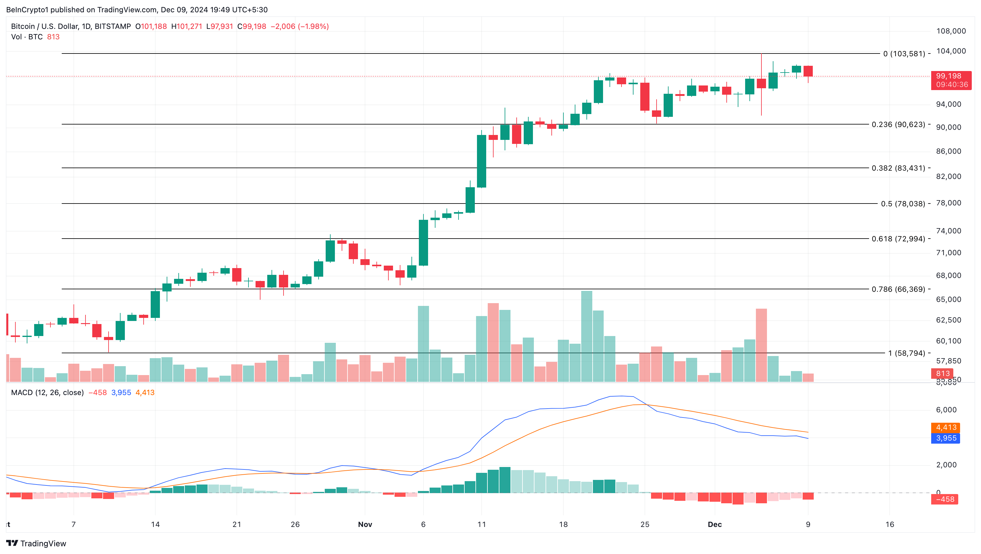 Słaba presja zakupowa Bitcoina (BTC) sprawia, że największa kryptowaluta odnotowuje dziś spadek, a cena oscyluje między 98 000 USD a 100 000 USD. Ten spadek byczego impetu sugeruje, że BTC może być gotowy na korektę.