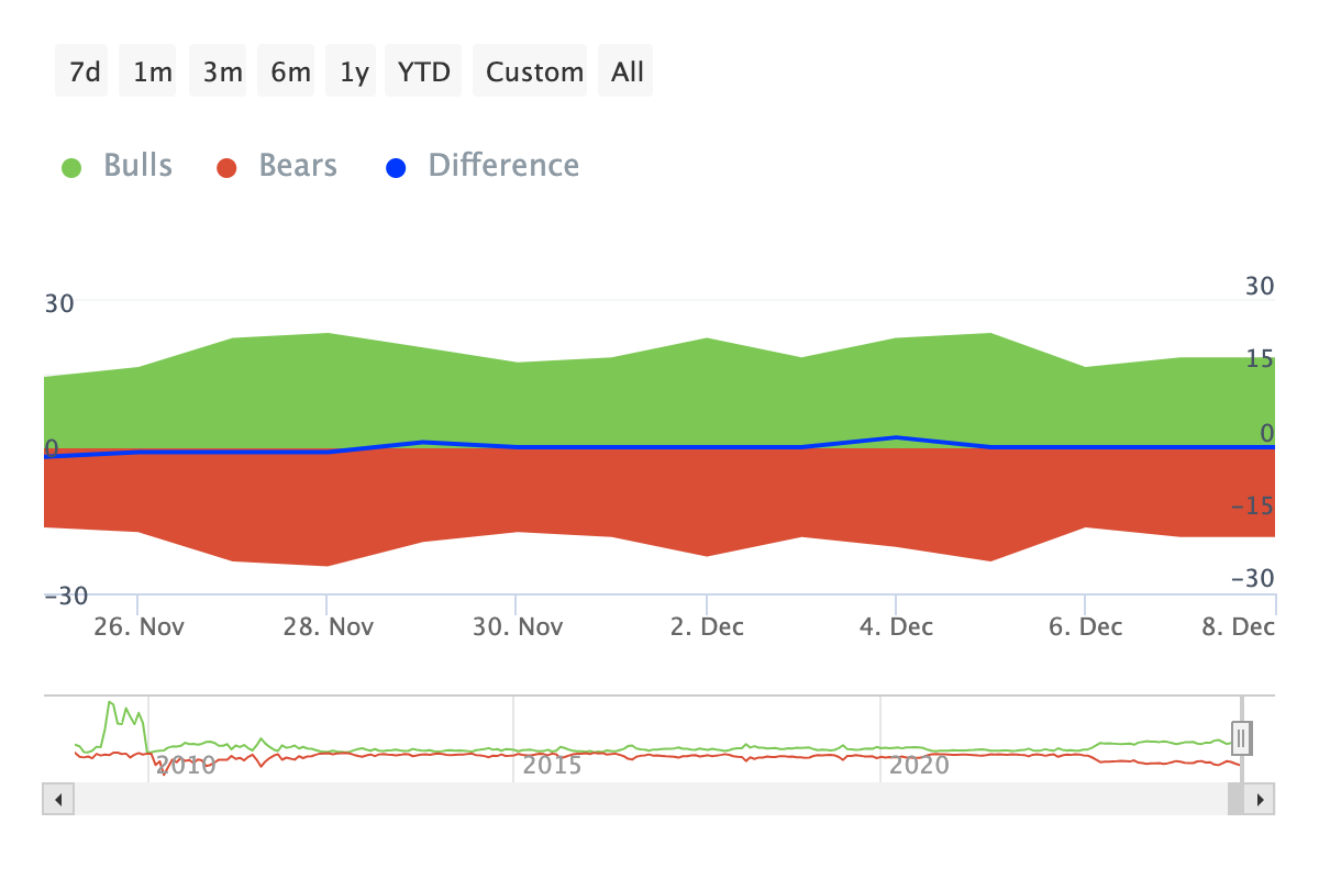 Kiedy jest więcej byków niż niedźwiedzi, cena BTC prawdopodobnie wzrośnie. Jednak jeśli przewagę mają niedźwiedzie, dzieje się odwrotnie. Według danych IntoTheBlock liczba byków i niedźwiedzi w ciągu ostatnich siedmiu dni pozostała taka sama.