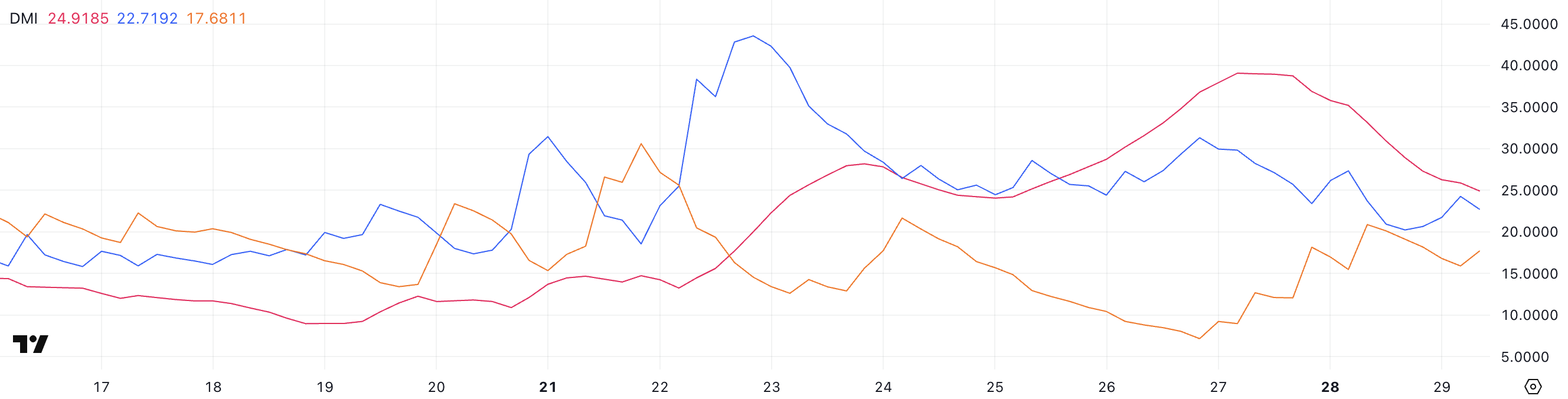 Wykres DMI Ethereum pokazuje, że jego ADX wynosi obecnie 24,91. Stanowi to gwałtowny spadek z 39 sprzed dwóch dni. ADX, czyli wskaźnik średniego kierunku, mierzy siłę trendu, niezależnie od tego, czy jest on wzrostowy, czy spadkowy.