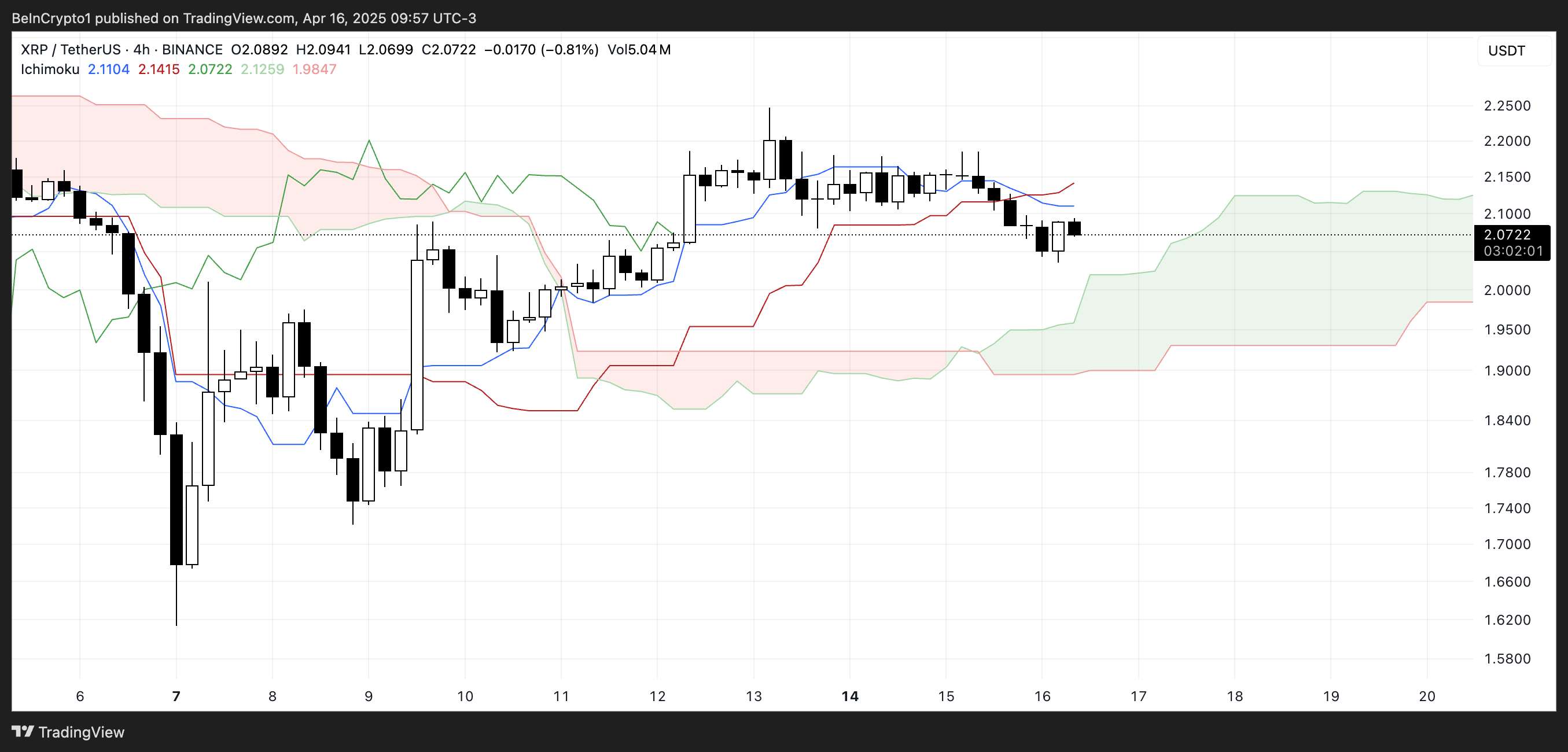 Wykres chmury Ichimoku dla XRP obecnie pokazuje przesunięcie w kierunku krótkoterminowej dynamiki niedźwiedziej.