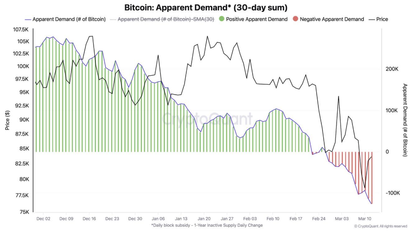 Jak wynika z przedstawionego powyżej wykresu, słabnący popyt na Bitcoin miał swoją kulminację w ostatnim tygodniu lutego 2025 roku. Wówczas od tamtego momentu wykres przekroczył linię zerową, pogłębiając malejący popyt na cyfrowe złoto. Analityk kryptowalutowy dla CyptoQuant odnosząc się do wykresu dodał: