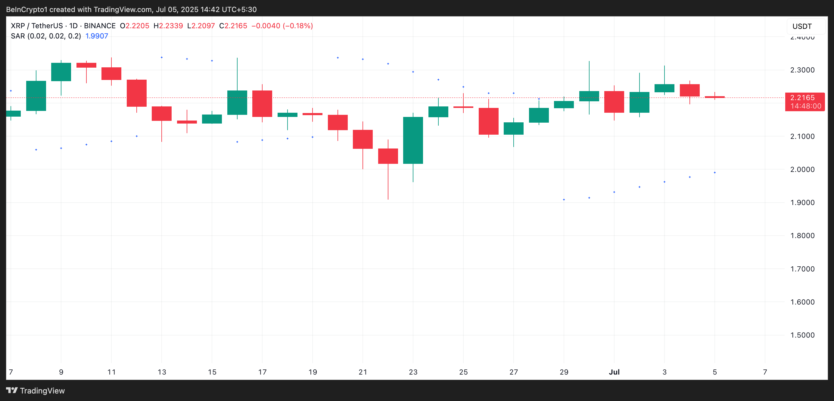 Dodatkowo, wskaźnik Parabolic Stop and Reverse (SAR) dla XRP potwierdza ten byczy sentyment. Na moment pisania, te kropki, które tworzą wskaźnik, znajdują się pod ceną XRP, oferując dynamiczne wsparcie na poziomie 1,99 USD.