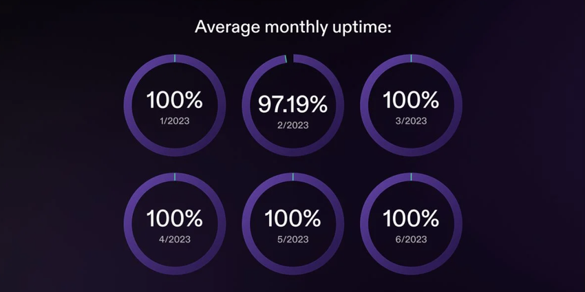 Poniższy zrzut ekranu z raportu wydajności Solany pokazuje, że sieć Solana utrzymała 100% uptime we wszystkich dotychczasowych miesiącach 2023 roku, z wyjątkiem lutego.