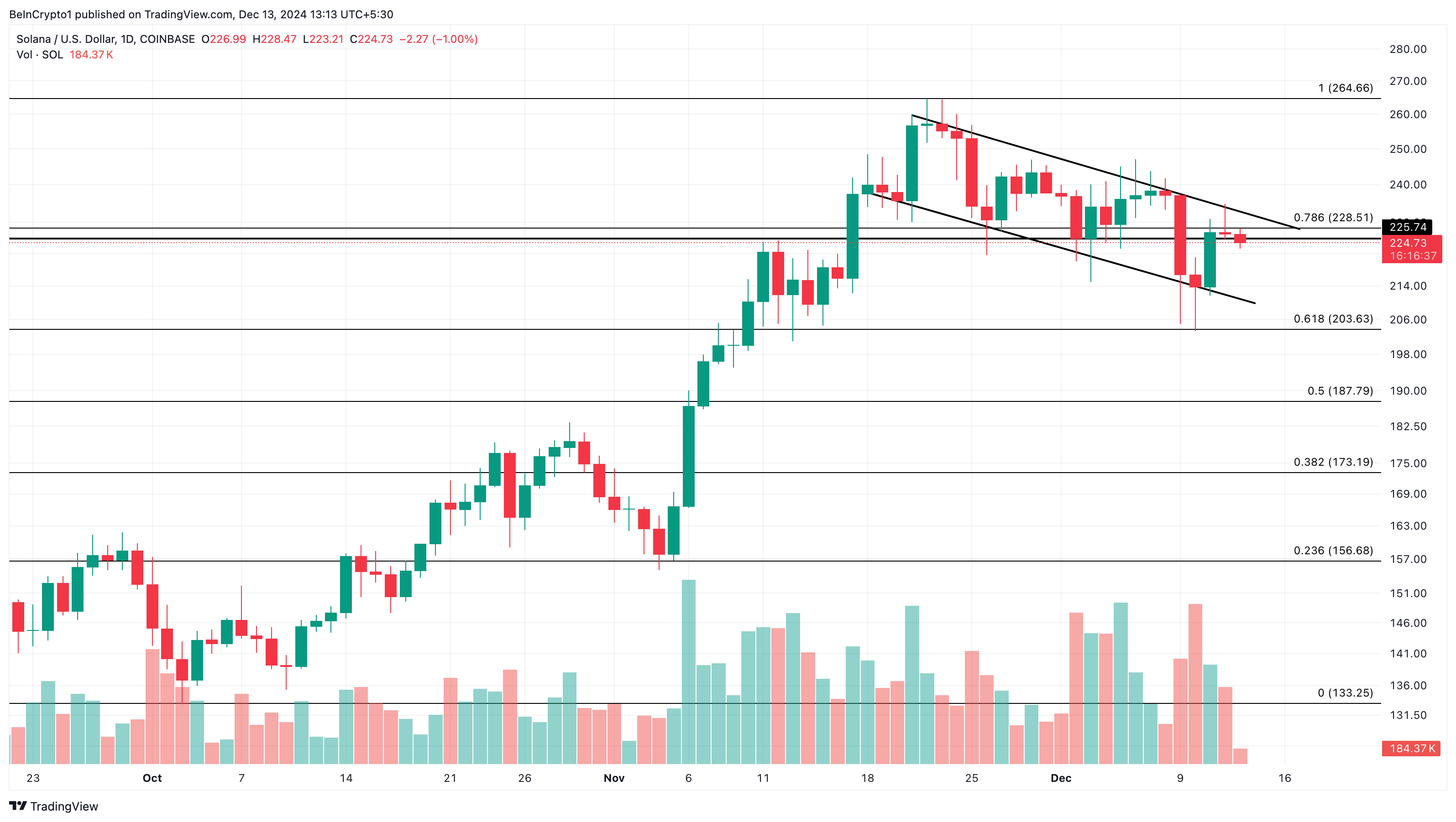 Na wykresie dziennym cena Solany przesuwa się w kanale zniżkującym od momentu osiągnięcia nowego rekordu wszech czasów 22 listopada. Co ważne, poniższy schemat pokazuje, że wartość altcoina spadła poniżej wsparcia na poziomie 225,74 USD.