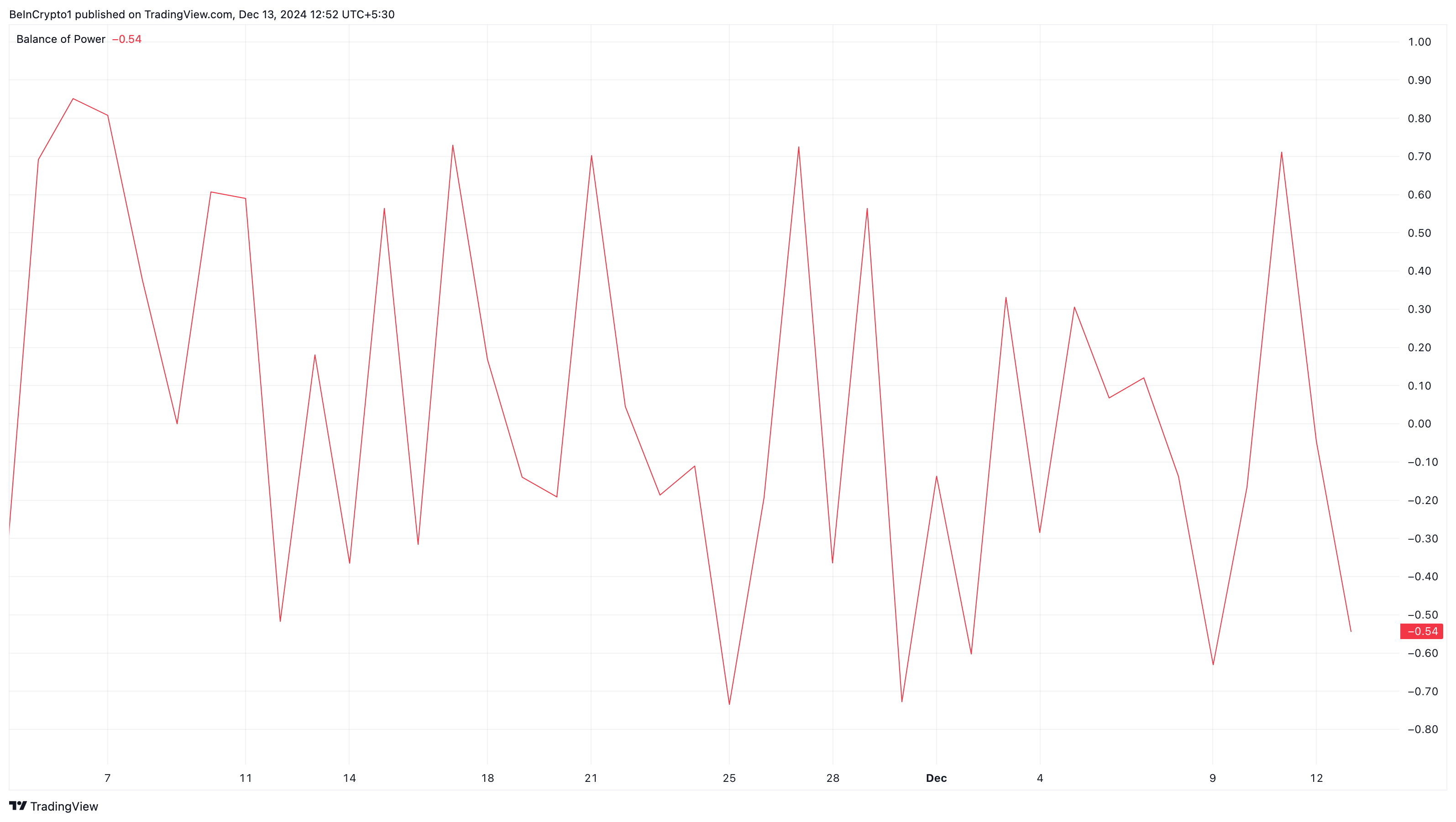 Na dziennym wykresie SOL/USD BeInCrypto zauważyło spadek wskaźnika Balance of Power (BoP) do strefy ujemnej. BoP to wskaźnik techniczny oparty na cenie aktywa. Ocenia on siłę i dominację kupujących w porównaniu do sprzedających, oferując traderom cenne informacje o dynamice kontroli rynku i potencjalnych zmianach trendu.