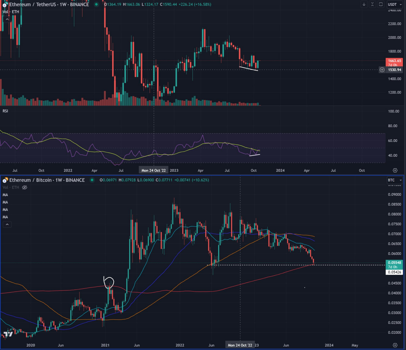 “Ethereum nie tylko zdołało stworzyć wzór odwrócenia na wykresie, ale także potwierdziło byczą dywergencję na wykresie tygodniowym. Łącząc to z pierwszym testem 200-tygodniowej średniej kroczącej, myślę, że ETH/BTC jest gotowy na niezły wzrost.”