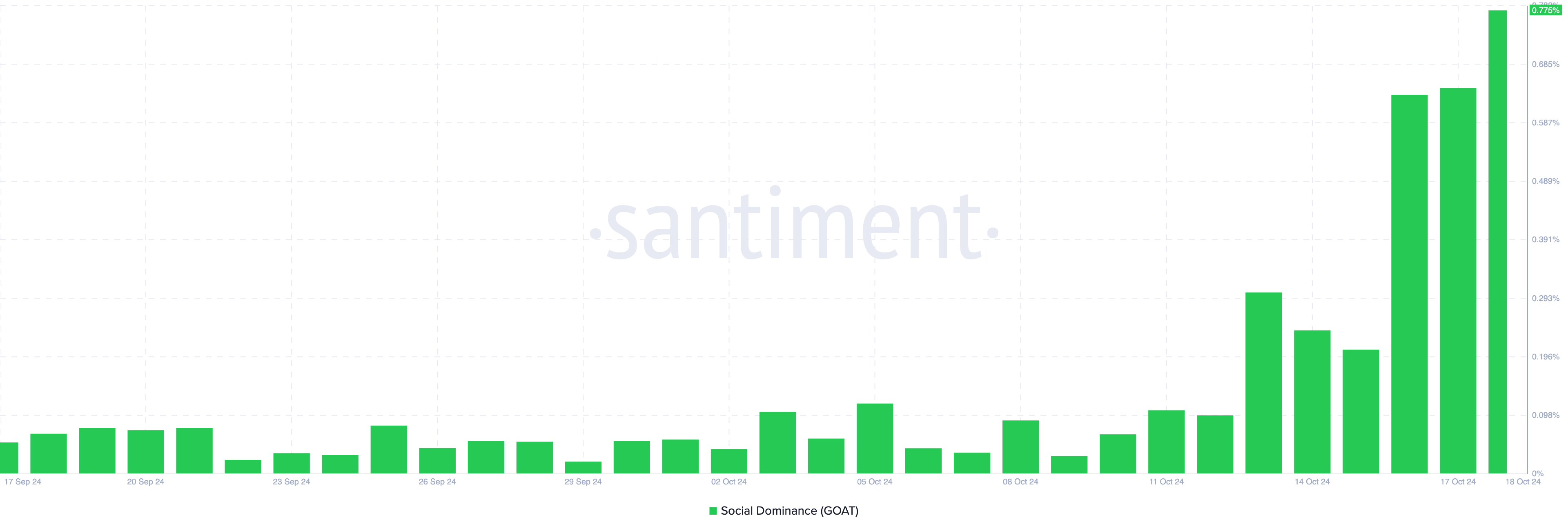 Ponadto dane on-chain z Santiment ujawniają ogromny wzrost dominacji społecznej GOAT. Jest to ważny indykator rosnącego zainteresowania.