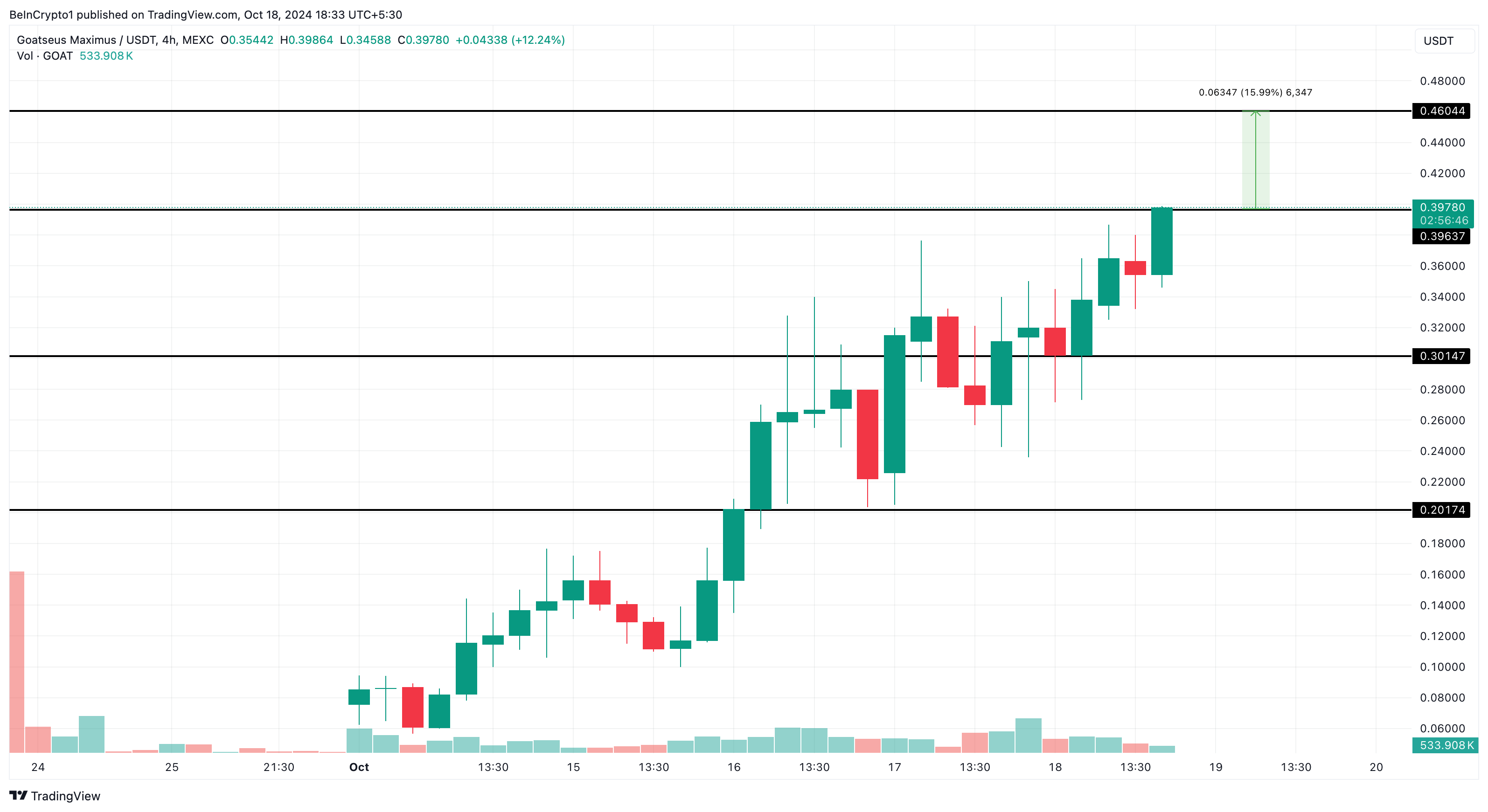 Bliższe spojrzenie na 4-godzinne wskaźniki techniczne dla Goatseus Maximus sugeruje, że memecoin posiada duży potencjał na dalsze zyski. Token utworzył silny poziom wsparcia na poziomie 0,30 USD, który się utrzymał.