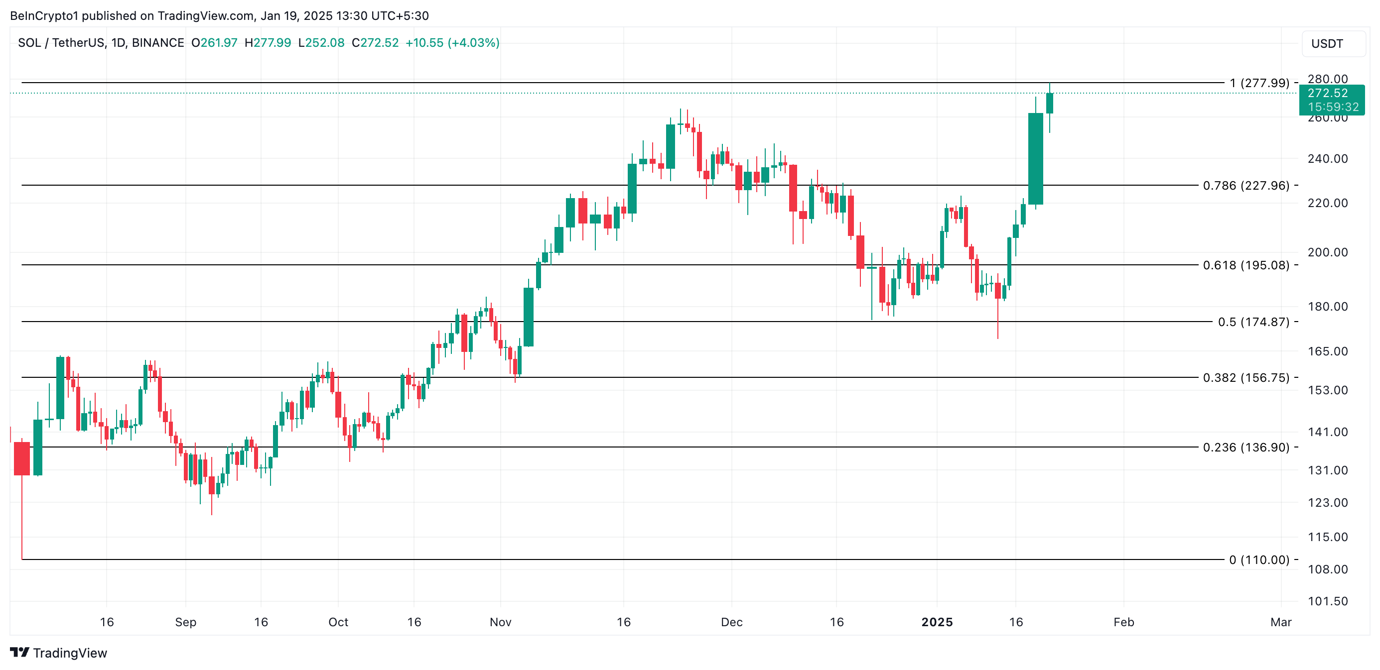 Na wykresie dziennym SOL handluje tuż poniżej swojego najwyższego poziomu 277,99 USD, który teraz tworzy poziom oporu. Przy utrzymującym się nacisku kupujących, altcoin przełamie ten poziom, przekształci go w strefę wsparcia i kontynuuje trend wzrostowy.