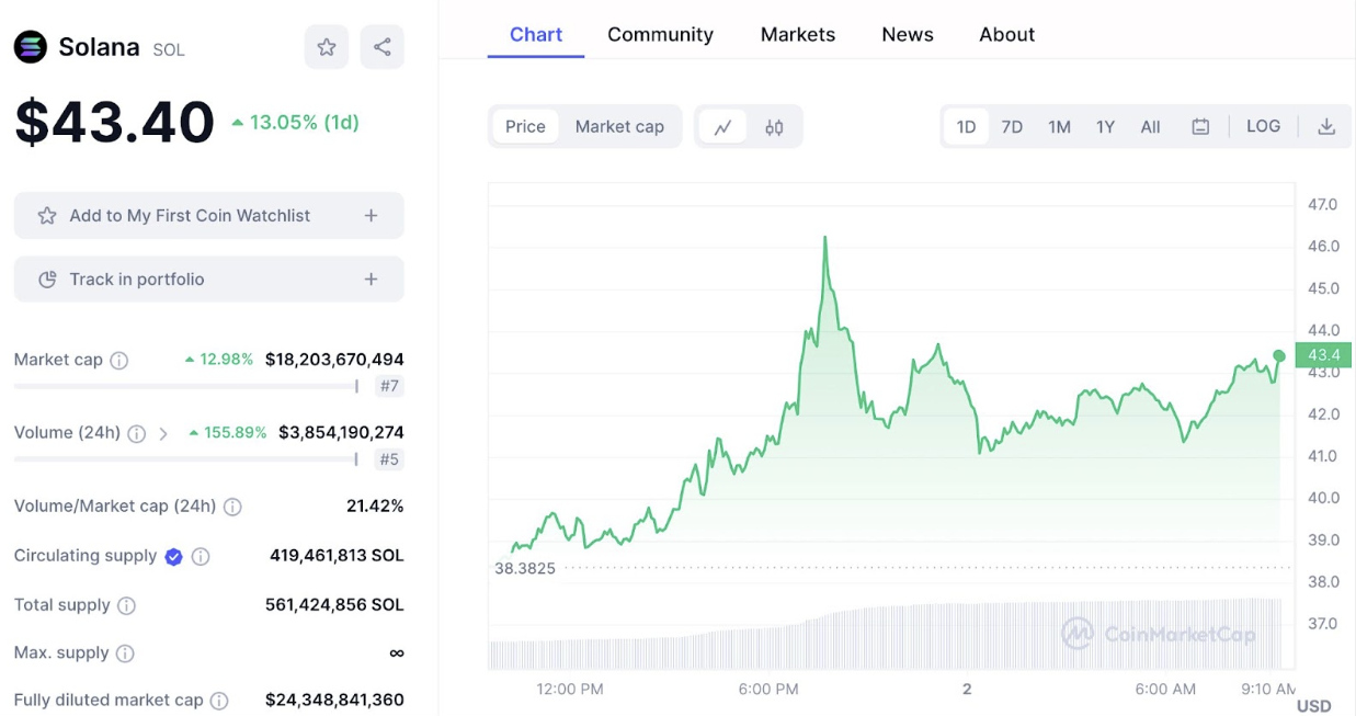 W krótkim okresie tygodnia, inwestorzy Solana byli świadkami jeszcze bardziej wyraźnej przemiany z ponad 50% skokiem wartości, gdzie cena momentami osiągała aż 46,97 USD.