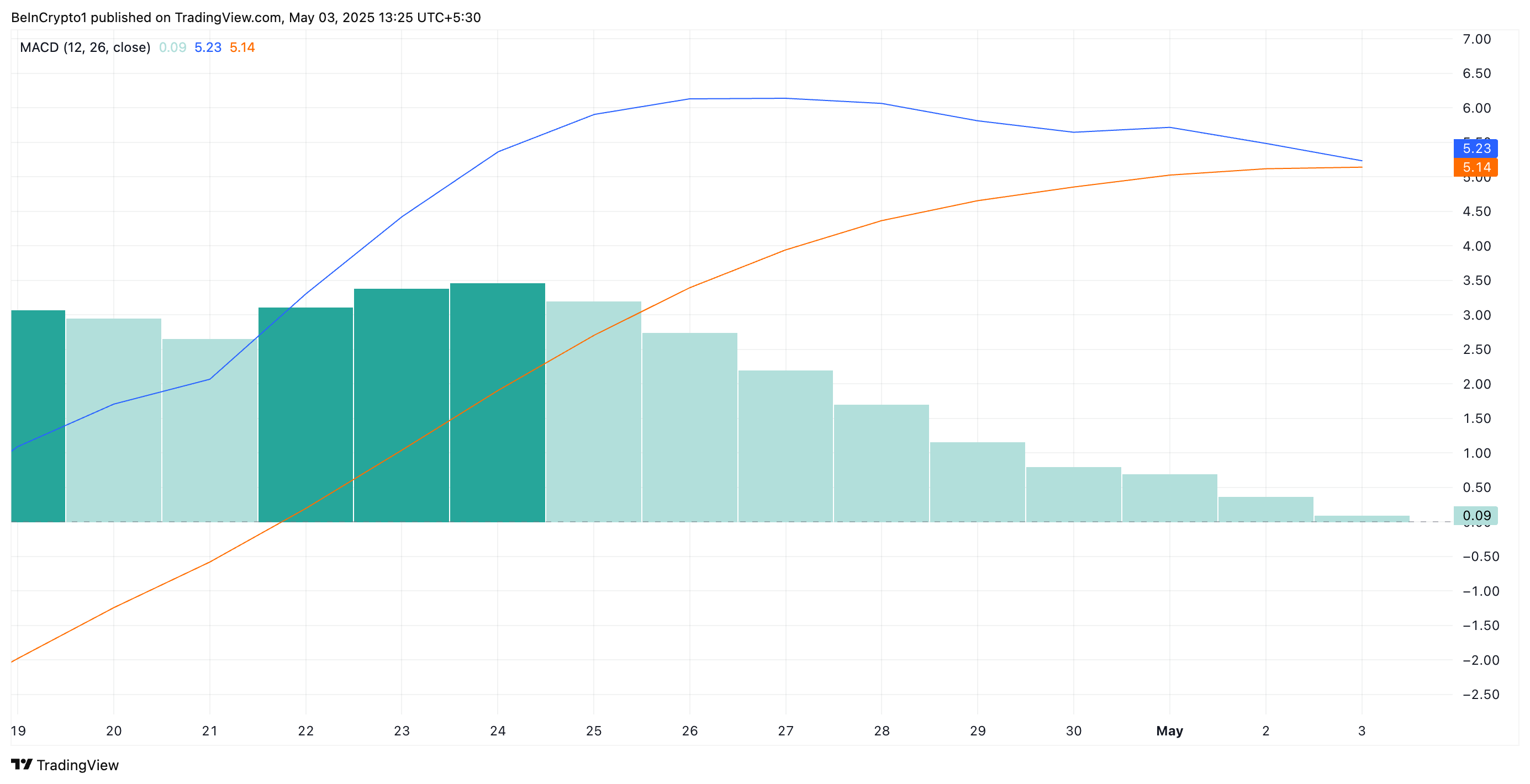 W momencie pisania, linia MACD (niebieska) znajduje się blisko linii sygnału (pomarańczowa), oczekując katalizatora, który sprawi, że przetnie ją w dół. Ten wzór często poprzedza trwały trend spadkowy i jest powszechnie postrzegany przez traderów jako oznaka osłabienia siły cenowej.