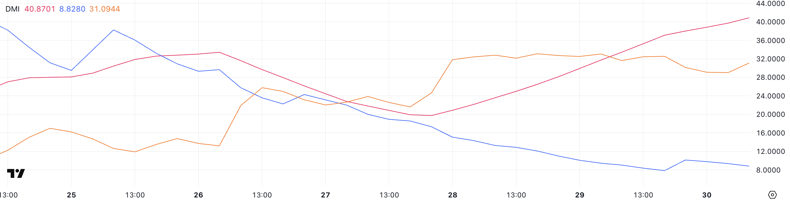 Wykres DMI Solany pokazuje gwałtowny wzrost ADX, który wynosi teraz 40,87. Jest to wzrost z 19,74 zaledwie trzy dni temu.
