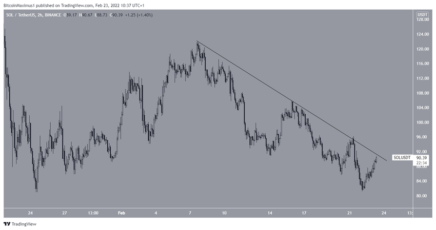 Na wykresie dwugodzinnym widać, że Solana od dnia 7 lutego podąża również za krótkoterminową opadającą linią oporu. Obecnie jest w trakcie trzeciej próby wybicia.