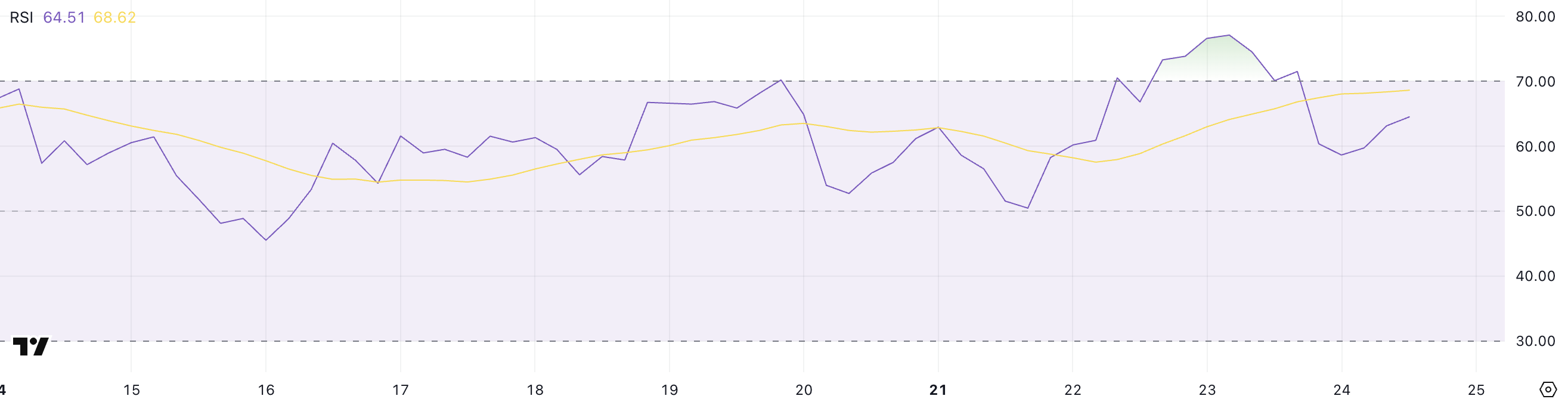 Wskaźnik siły względnej (RSI) dla Solana wynosi obecnie 64,51, ochładzając się z niedawnego szczytu 77 zaledwie dzień temu. Co ciekawe, odbił się z dziennego spadku do 58,64, sygnalizując potencjalną zmianę krótkoterminowego impetu.
