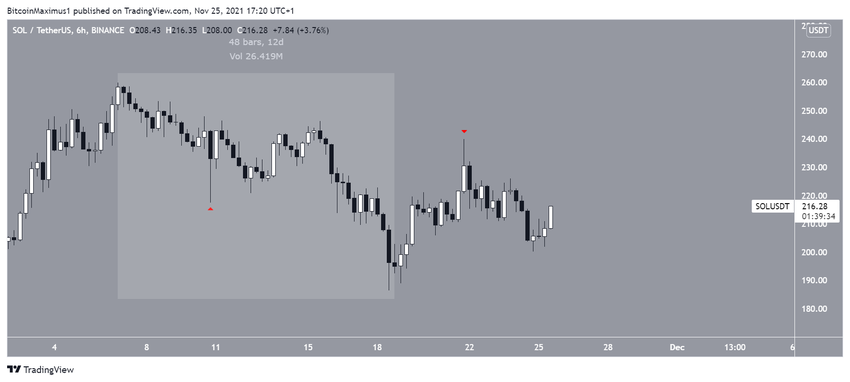 Krótkoterminowy wykres sześciogodzinny pokazuje, że Solana spada wzdłuż opadającej linii oporu od 5 listopada. Ostatnio została odrzucony przez tę linię w dniu 23 listopada.