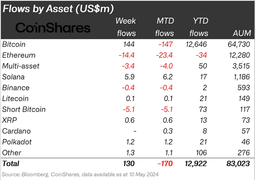 W tygodniu kończącym się 10 maja SOL okazał się altcoinem o najwyższych wpływach, wynoszących prawie 6 mln USD. Spowodowało to wzrost przepływów netto od początku roku z 11,1 mln USD do 17 mln USD.