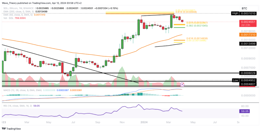 Rozwój sytuacji sugeruje potencjalne bycze odbicie dla Solana z możliwością odbicia ceny od wsparcia Fibonacciego w zakresie od około 0,0021 BTC do 0,0023 BTC. Potencjalnie może to zainicjować trajektorię wzrostową.