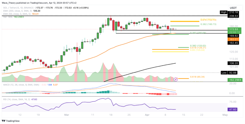 Przedwczoraj Solana osiągnęła 50-dniowe wsparcie EMA na poziomie 0,382 Fib, w przybliżeniu przy 160 USD. Następnie mocno się odbiła. Obecnie cena SOL napotyka znaczące opory Fib w okolicach 180 USD i 195 USD.