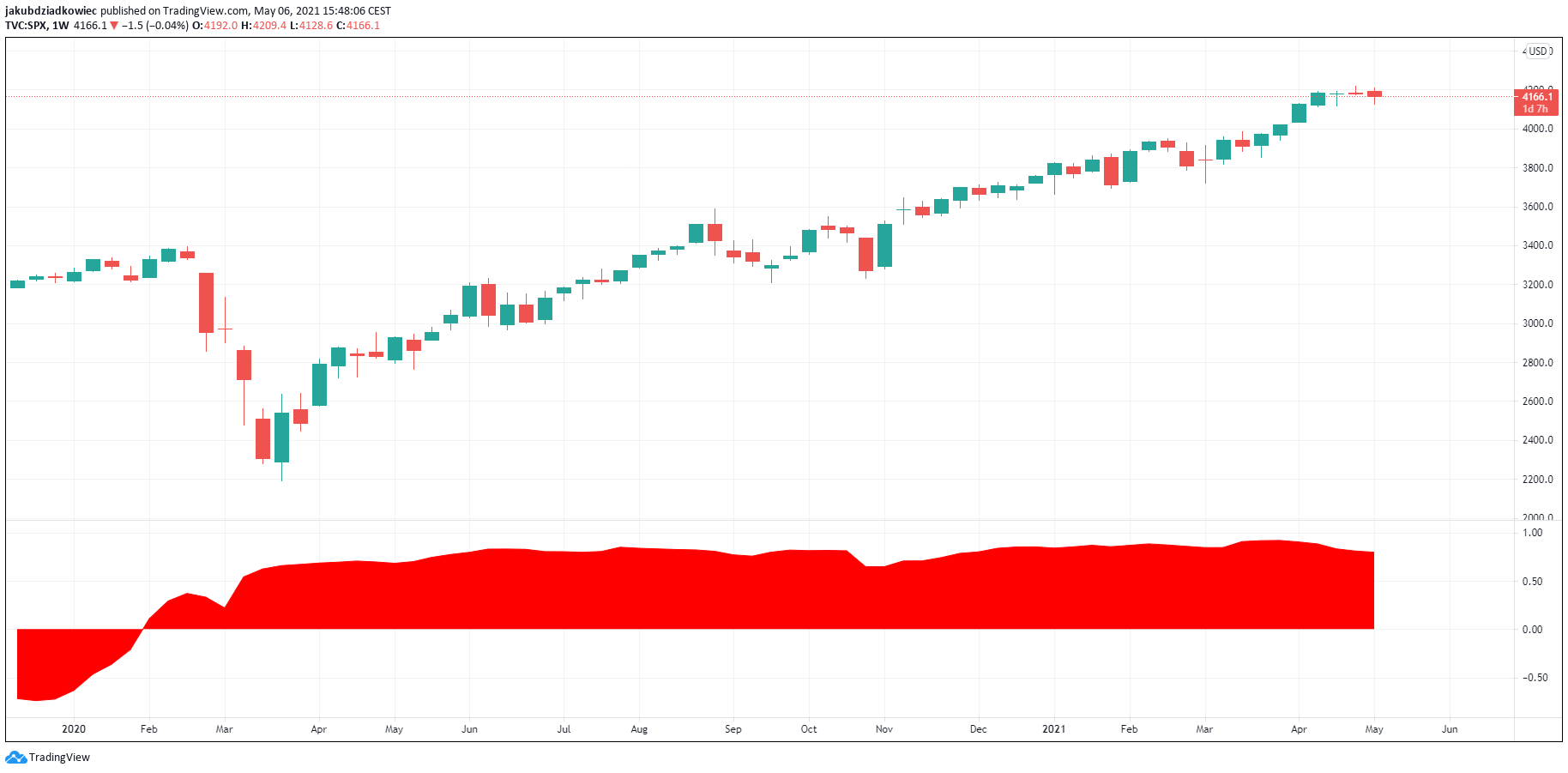 Na obecną chwilę korelacja wynosi 0,8. Indeks S&P 500 – podobnie jak największa kryptowaluta – znajduje się w długoterminowym trendzie wzrostowym.