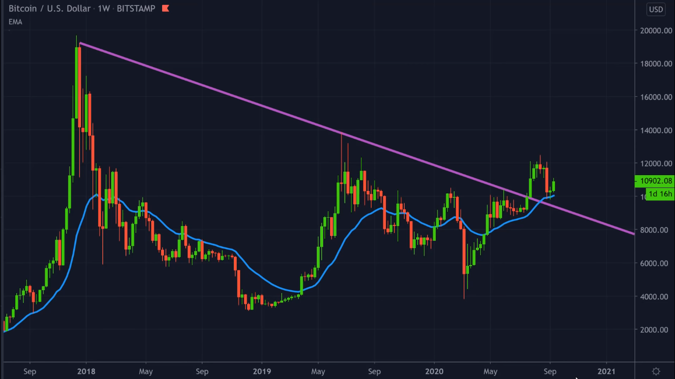 SponsoredW uzasadnieniu swojego przekonania wskazuje, że w ostatnich tygodniach Bitcoin dokonał byczego wybicia z długoterminowej, opadającej linii oporu. Wybicie doprowadziło niedawno cenę do obszaru 12 000 USD, aby następnie wykonać korektę do okolic poniżej 10 000 USD. Te ostatnie pokrywają się z 21-tygodniową ekspotencjalną średnią kroczącą (EMA), która historycznie służyła za wsparcie w długoterminowym rynku byka (niebieska linia):