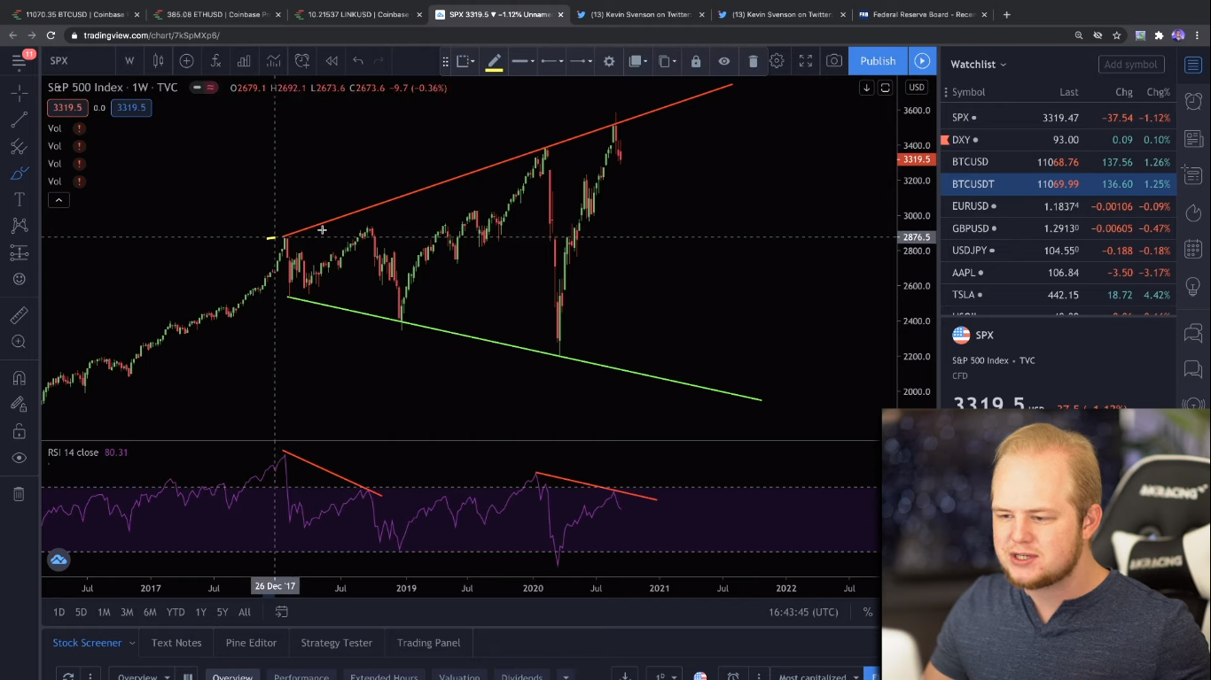 W szczegółowej analizie nakreśla on potężną niedźwiedzią dywergencję rozpościerającą się pomiędzy rosnącą akcją cenową SPX w okresie marzec-wrzesień 2020, a odpowiadającym jej malejącym RSI. Co więcej, zauważa, że identyczna sytuacja miała miejsce w 2018 roku tuż przed dużą korektą tradycyjnego rynku, która również doprowadziła cenę BTC do dołka na 3 100 USD.