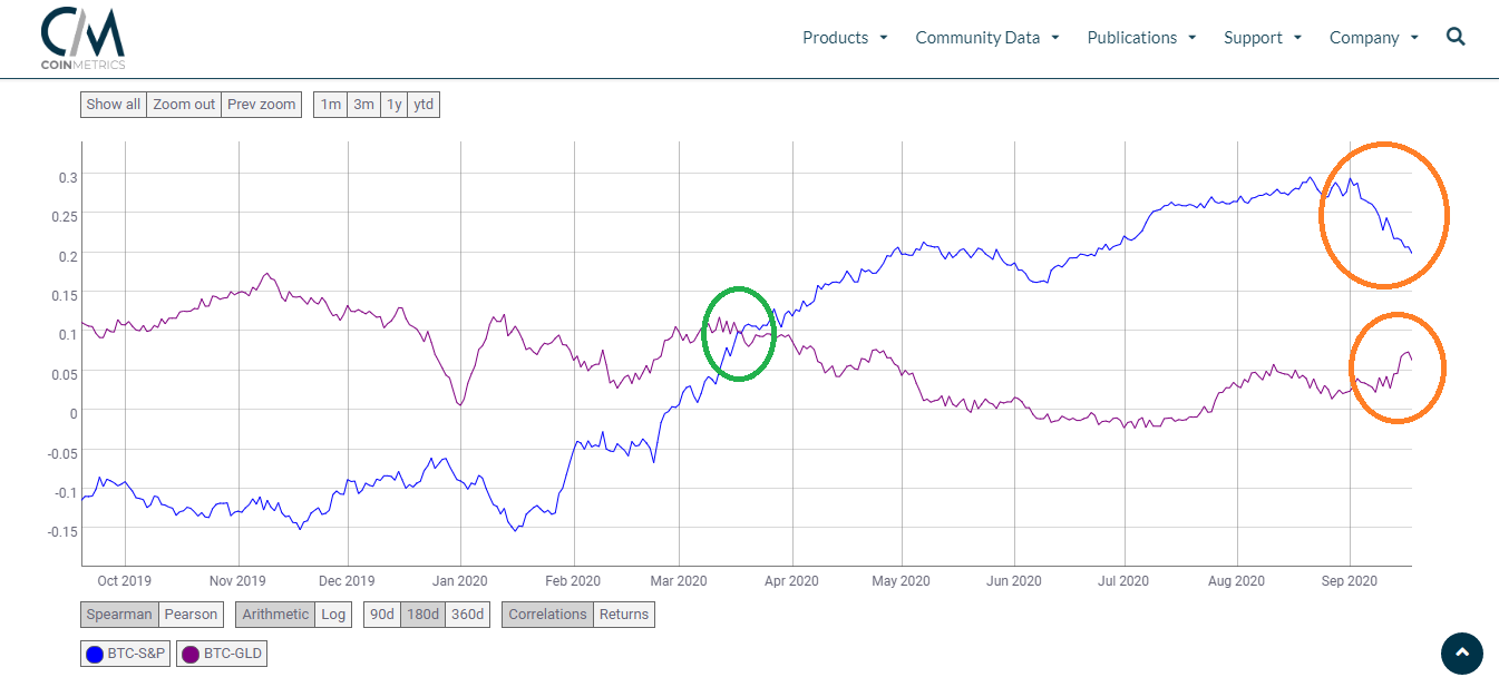 Pomimo tego, istnieją pierwsze oznaki osłabienia tego związku. W najnowszych danych z witryny CoinMetrics możemy faktycznie zaobserwować trwające od początku września osłabienie korelacji Bitcoina z S&P 500 (niebieski wykres). Co więcej, korelacja ze złotem (fioletowy wykres) stopniowo rośnie: