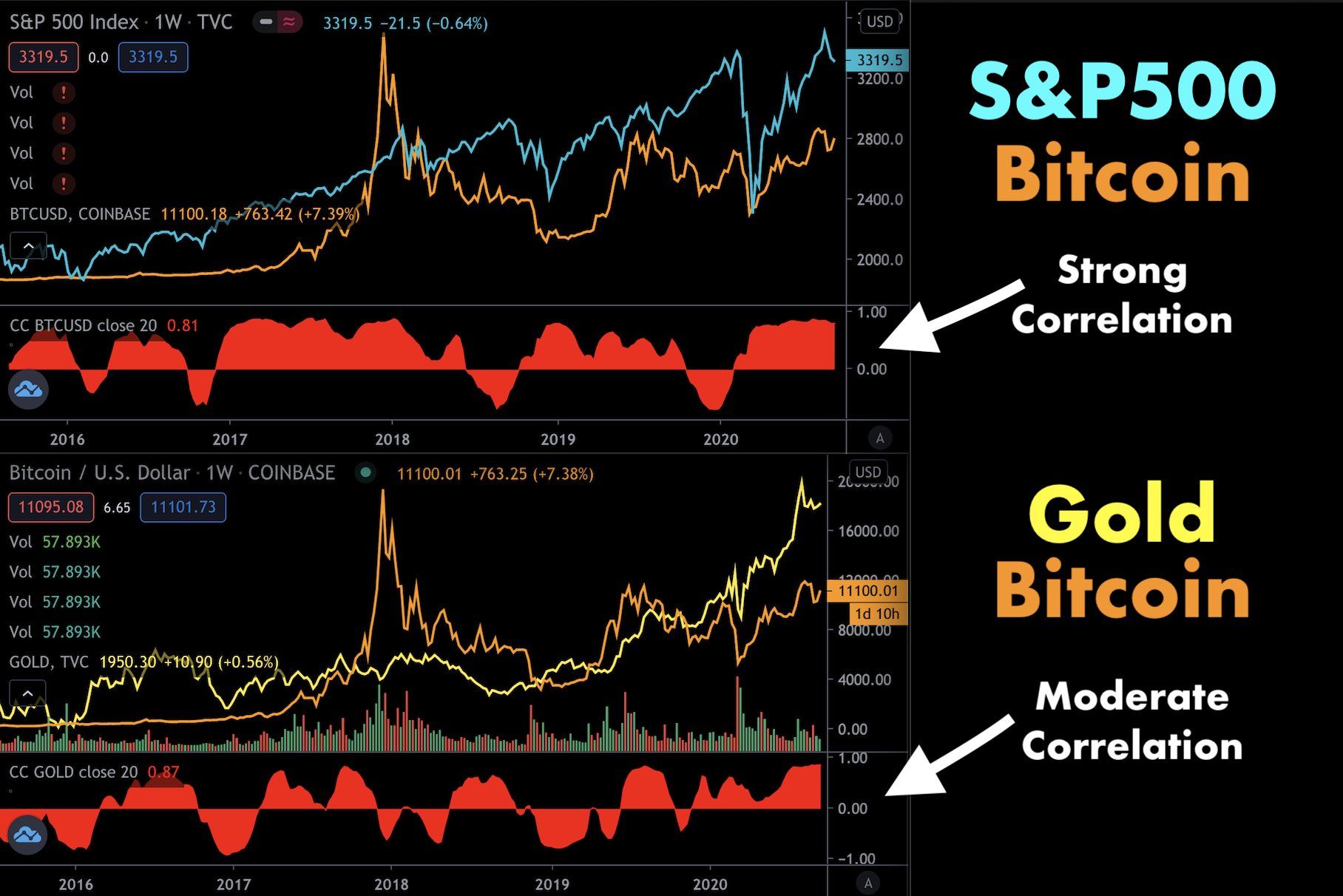 Rastani twierdzi, że korelacja ceny Bitcoina z notowaniami S&P 500 wciąż jest bardzo wysoka i nie istnieją żadne dowody, że została przerwana. Potwierdzają to również analizy Svensona, który prezentuje silną korelację BTC z SPX oraz umiarkowaną korelację ze złotem: