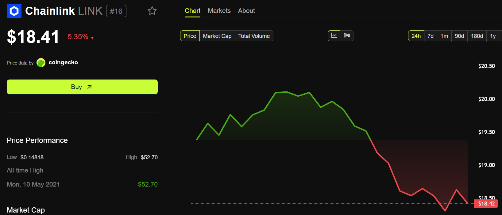 LINK kosztował 18,41 USD w momencie pisania tego tekstu, spadając o ponad 5% w ciągu ostatnich 24 godzin. Spadek nastąpił pomimo tego, że S&P Global Ratings, lider w analizie kredytowej, teraz publikuje swoje oceny stabilności stablecoinów na publicznych blockchainach za pośrednictwem DataLink Chainlink.