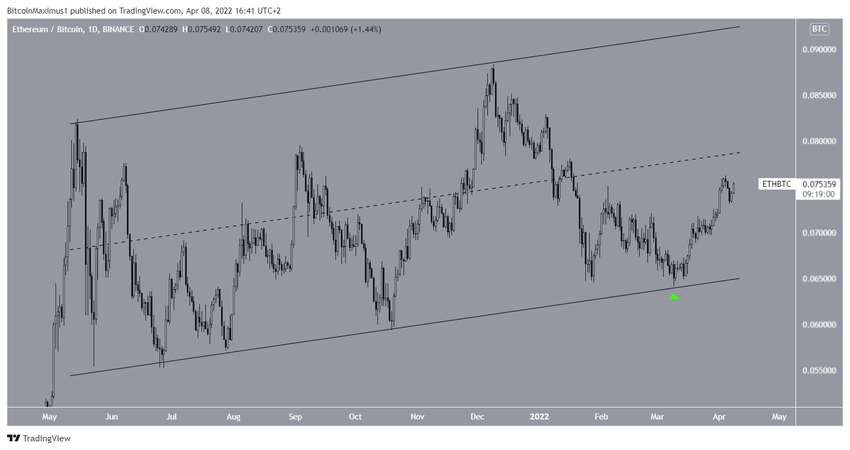SponsoredOd maja 2021 r. ETH jest notowany wewnątrz równoległego kanału wzrostowego. Wzrasta po odbiciu się od linii wsparcia w dniu 9 marca 2022 r. Obecnie cena zbliża się do środka tego kanału.