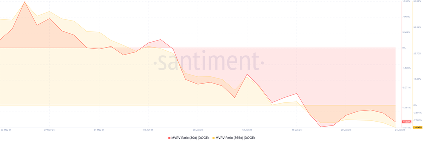 Stosunek wartości rynkowej Dogecoina do wartości zrealizowanej (MVRV), analizowany na podstawie 30-dniowych i 365-dniowych średnich kroczących, wykazuje obecnie wartości ujemne. W chwili pisania tego tekstu wskaźniki MVRV dla DOGE wynoszą -16,83% dla średniej 30-dniowej i -10,96% dla średniej 365-dniowej.
