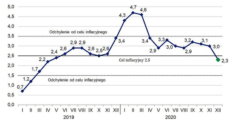 Według danych Głównego Urzędu Statystycznego (GUS) trzeci miesiąc z rzędu spada inflacja w Polsce. W grudniu wynosiła on 2,3%, podczas gdy w listopadzie i październiku odpowiednio 3,0% i 3,1%.